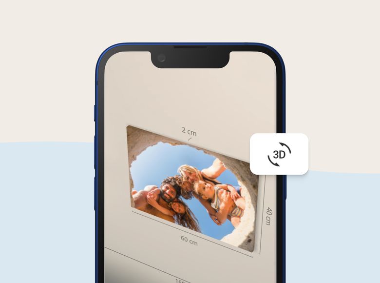 Découvrez votre déco photo en 3D et visualisez-la sous tous les angles ; de sa taille, à son épaisseur en passant aussi par ses finitions.