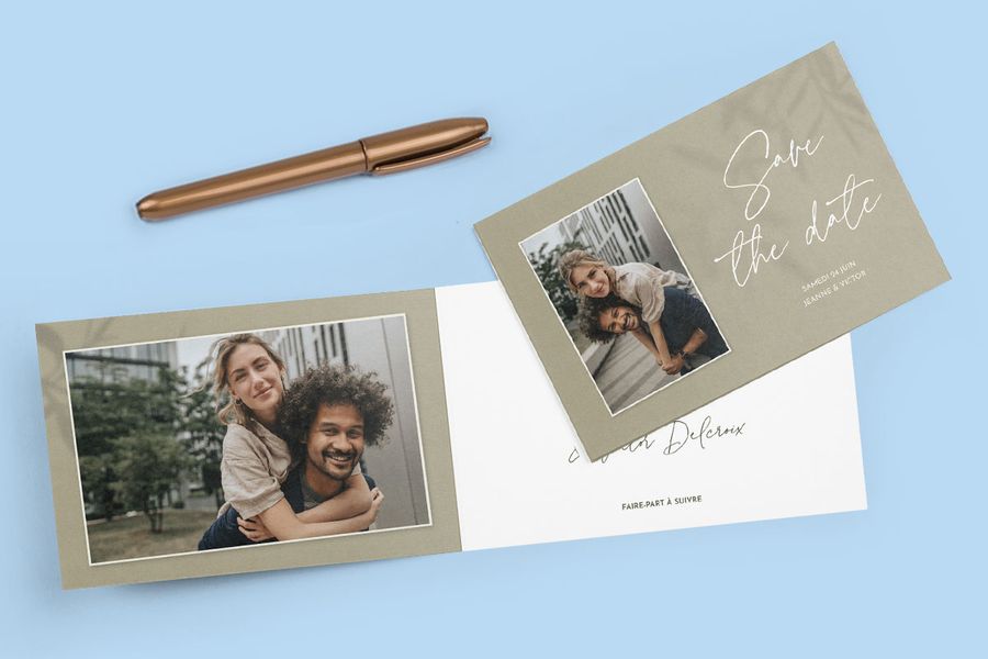 Avec photobox, trouver la bonne formulation pour une carte save the date, c’est facile. Parcourez plus de 60 modèles à thème, dénichez le design de carte save the date idéal pour votre mariage et adoptez ou modifiez le texte prédéfini pour qu’il corresponde aux détails de votre mariage. Si vous souhaitez ajouter une touche plus personnelle à vos cartes save the date, utilisez nos textes comme modèle et créez à votre guise.